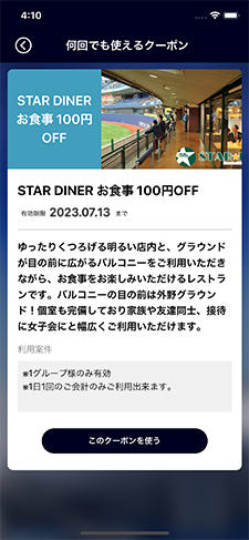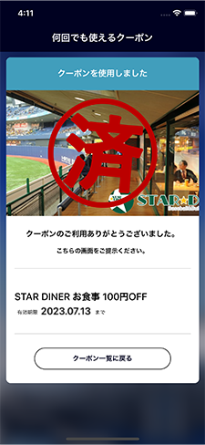 店舗スタッフの指示に従いボタンを押します。完了するとクーポン一覧に戻ります。