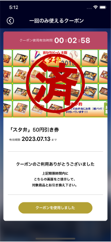 カウントダウンが終了する前にスタッフへ提示してください。使用済みのクーポンは一覧画面に戻ると消去されます。