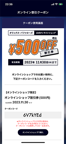 オンラインショップで使用の場合:クーポンコードを長押しするとコピーができますので、コピーして「オンラインショップで購入」を押してください