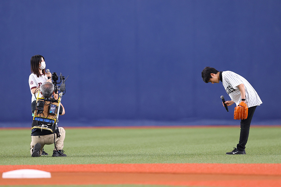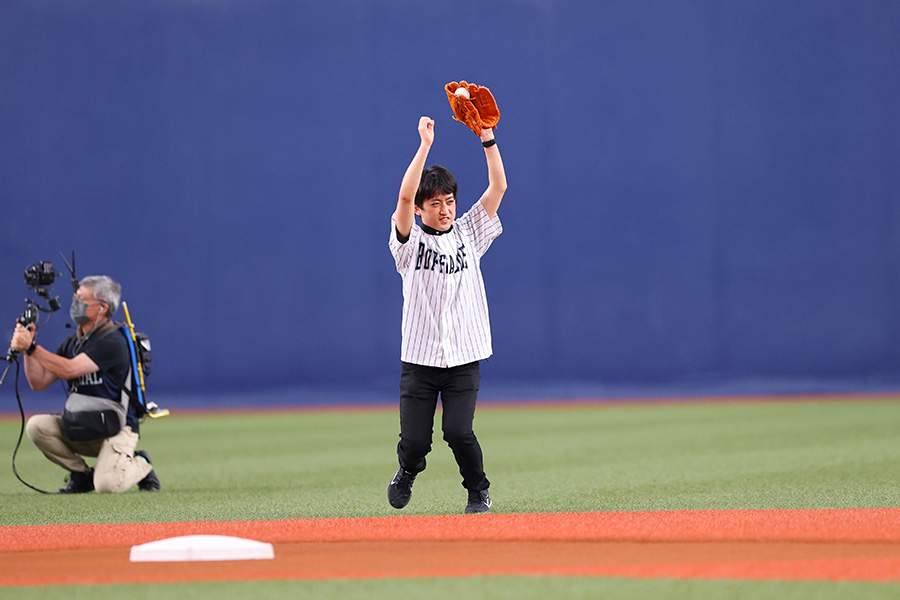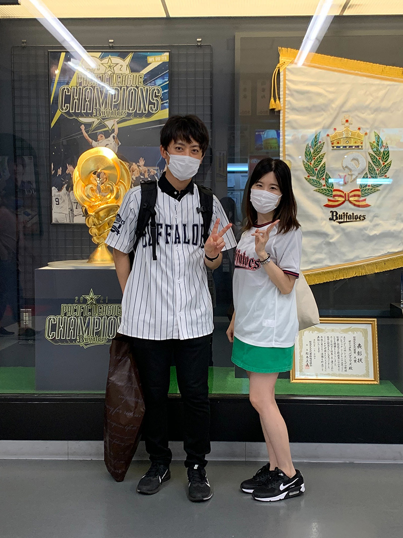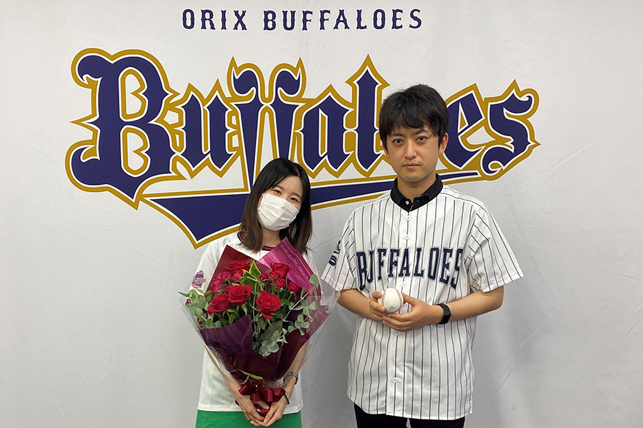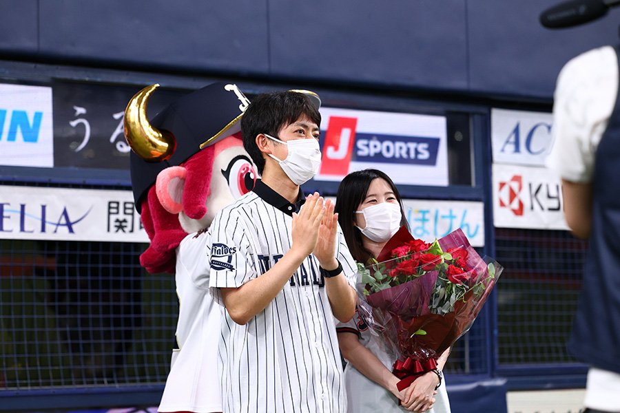 フライキャッチを終えて、誠也さんは「すごく緊張しました。正面に飛んできてくれてよかった…」とほっとした表情。綾乃さんは「選手から花束をもらえる企画と聞いていたので、全然違ってびっくり。普段あまりロマンチックなことはしない人なのに…。でも嬉しかったです」と興奮冷めやらぬ様子で答えてくれました。二人はもうしばらくは離れて暮らすことになるそうですが、誠也さんは「いずれ一緒に生活できれば嬉しいです」とこれから共に歩む未来に期待を膨らませていました。 この日の試合は、6-2でバファローズが快勝。特別な日に結ばれた二人を盛大に祝福してくれました。(西田光)