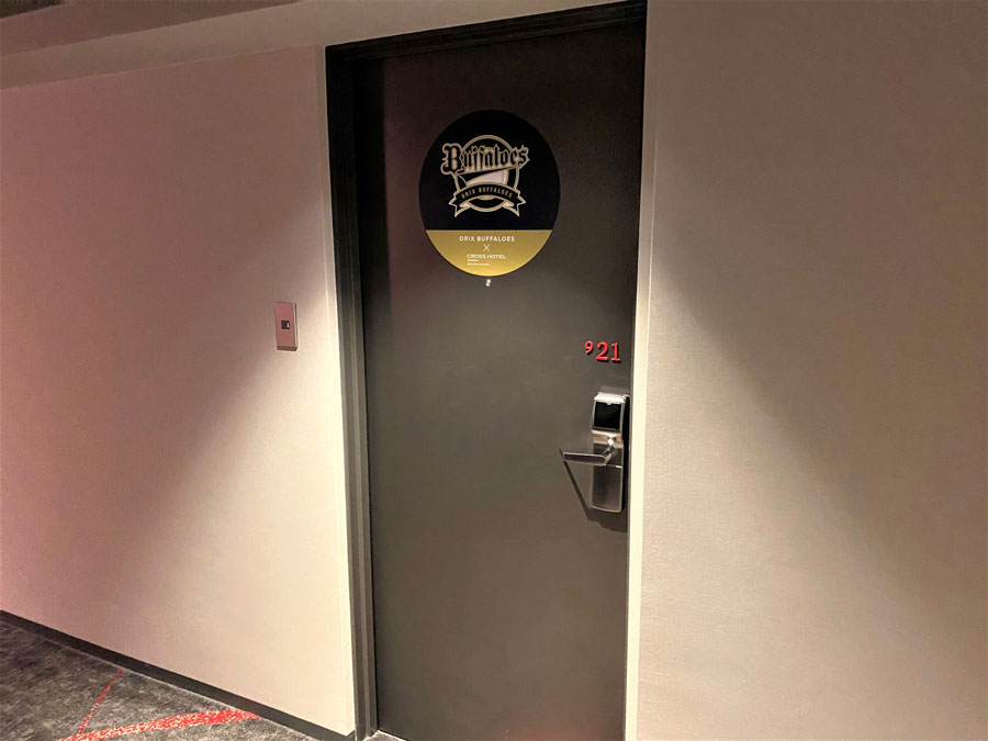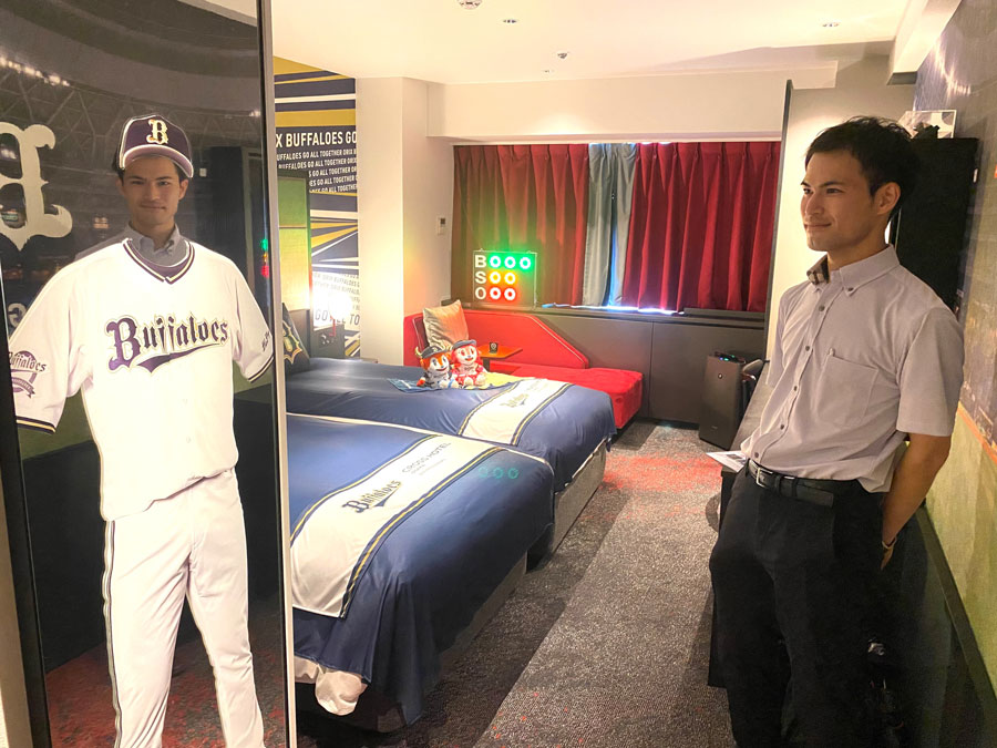 「Bs ROOM」の扉には、ばっちりバファローズのロゴが。若山総支配人は「他のお部屋をご利用のお客様にも興味を持っていただき、次回以降の宿泊のきっかけになるよう目立たせました」。
