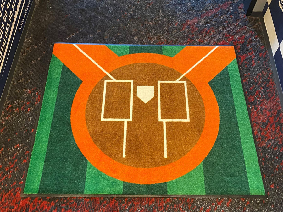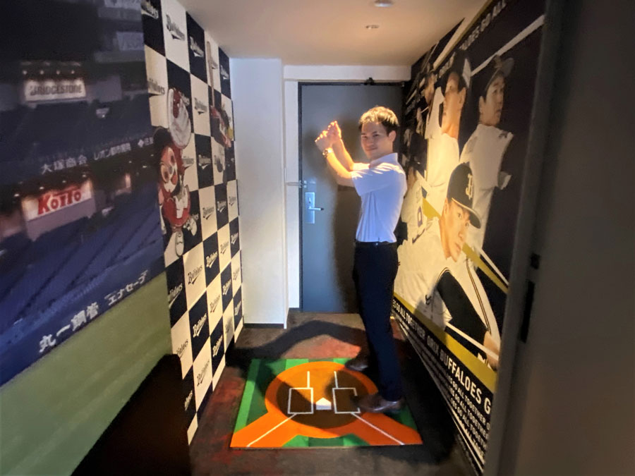 扉を開けてすぐに目に飛び込んできたのは、足元のフロアマット。バッターボックス風のデザインで、思わずバットを構えたポーズで写真を撮ってしまいます。左バッターボックスの後ろにはバファローブル&ベル、その向かいには躍動する選手たちのデザイン壁紙がお出迎えしてくれます。