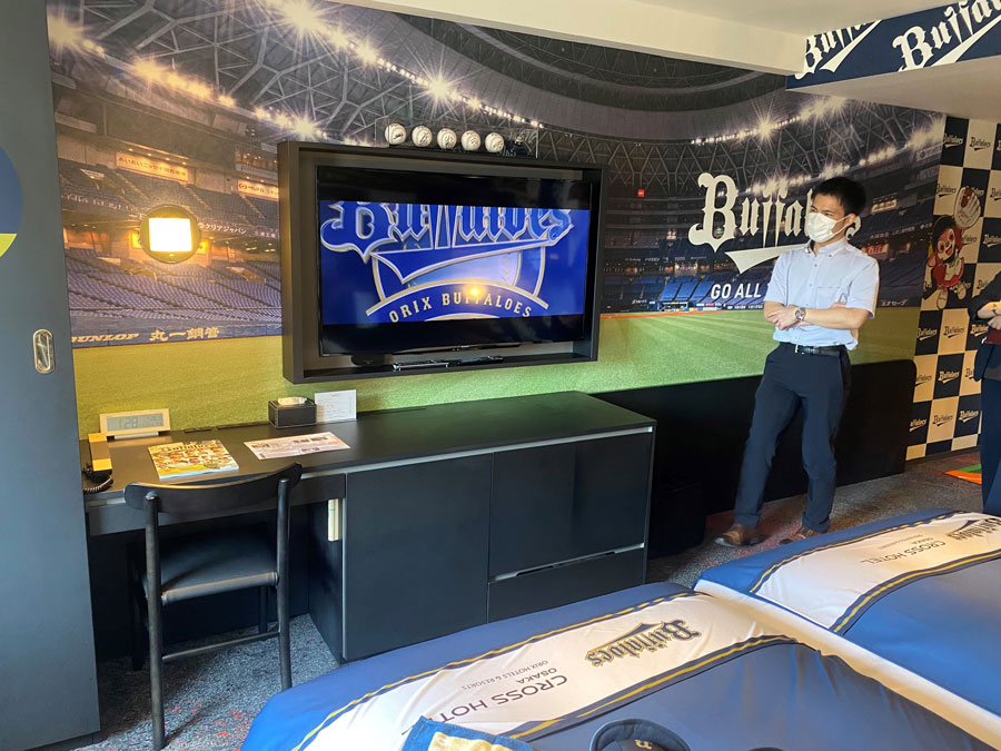 テレビ側の壁紙は、京セラドーム大阪をグラウンドから写した景色。まるで外野付近から試合を見ているような感覚に。若山総支配人は「ドームのど真ん中で寝転んで野球をお楽しみいただけるような、大変贅沢な空間です」とアピール。この部屋のテレビでは、京セラドーム大阪のビジョンで流れるチームの紹介映像も見ることができます。