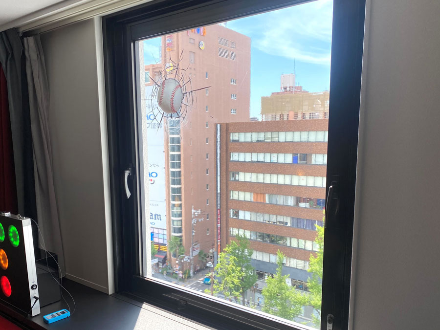 「BSOベースボールカウンターボード」も設置。ストライクの点灯ボタンを三回押すと、自動的にアウトのライトが光る本格仕様です。そして、お隣の窓ガラスは、ボールがぶつかってひびが入った粋なデザインです。
