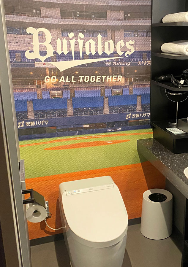 細部にまでこだわりが詰まった、バファローズ愛溢れる「Bs ROOM」。ぜひご宿泊いただき、身も心もバファローズに浸かっておくつろぎください!(西田光)