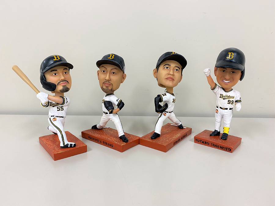 ボブルヘッドは、コレクションアイテムとして人気が高い首振り人形。今シーズンは、宮城大弥投手、平野佳寿投手、T-岡田選手、杉本裕太郎選手のボブルヘッド付きチケットを販売。どれも予定枚数を終了し、好評を博している。