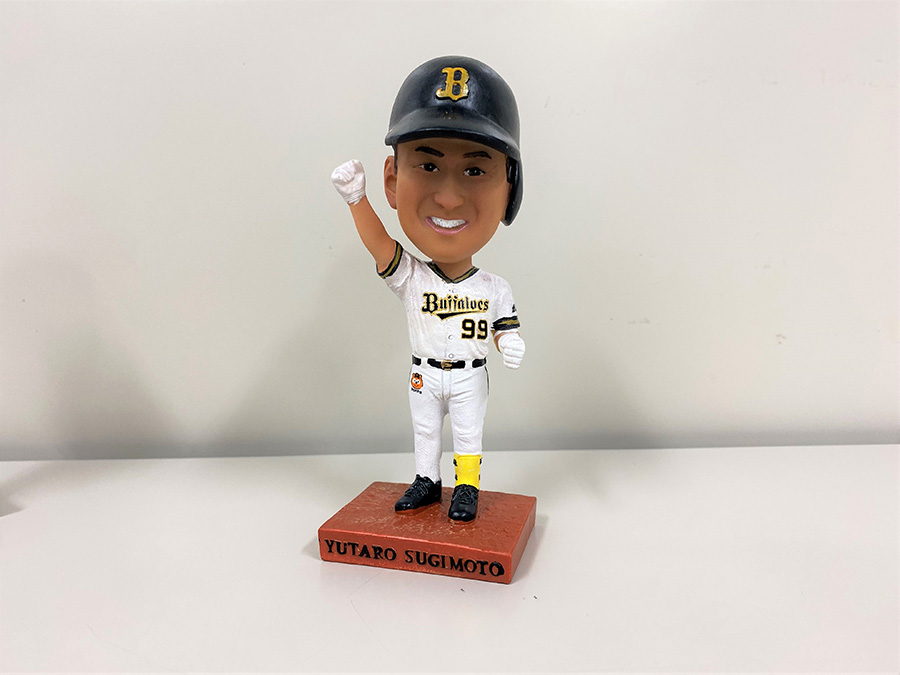 今シーズン、特に思い入れが強いのは杉本選手のボブルヘッドだという。バッティングシーンや投球シーンのものが一般的な中、昇天ポーズの採用は前澤にとって挑戦だった。キャンプ時に「今シーズンも昇天ポーズしますよね?」と球団宣伝グループの仁藤拓馬を通して確認し、このポーズでの製作に踏み切った。「他の選手のプレー中の真剣な表情とは違い、ホームランを放った後に出る笑顔が印象的。本人らしく仕上がりました」と前澤は胸を張る。