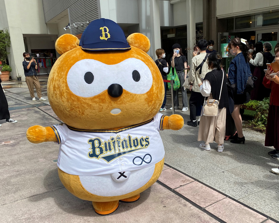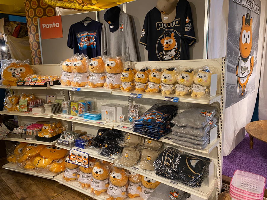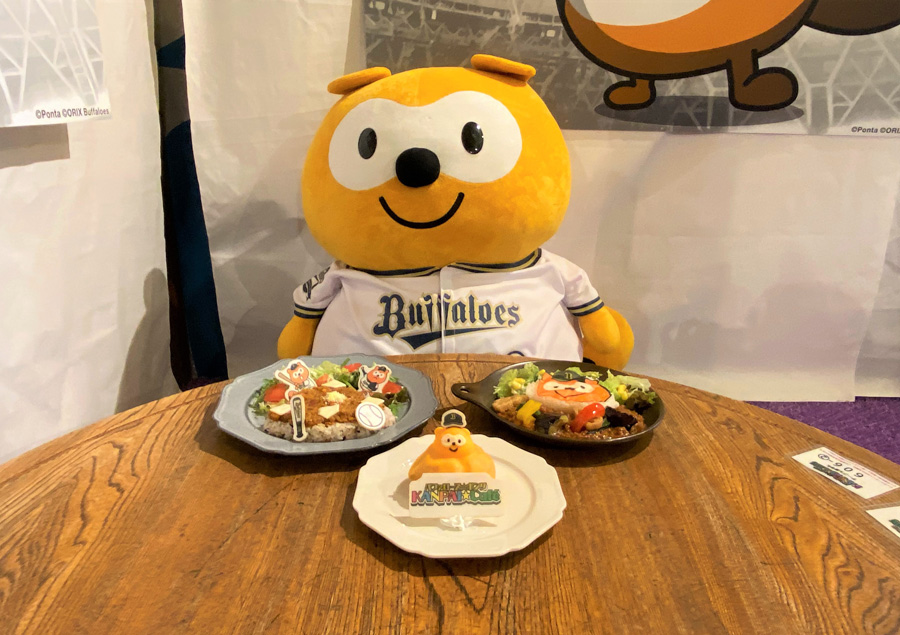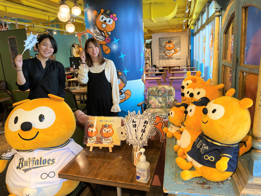 見渡す限りバファローズ☆ポンタ。誰もが「おりほー!」気分に浸れること間違いなしのご機嫌なカフェが、大阪市中央区、南海電鉄なんば駅下車すぐのなんばCITY南館にオープンしました。バファローズのスポンサー、株式会社ロイヤリティ マーケティングが企画・運営されている7日間限定の特別なカフェ。「バファ☆ポンもりもりのカフェが5年ぶりに復活です!一緒に乾杯気分を味わってください」と胸を張って話すのは、同社ブランディング・コミュニケーション部の舛田麻奈さんと吉田華さん。このカフェのために結成された「バファローズ☆ポンタカフェチーム」を代表して、お二人に今回のカフェへのこだわりとバファ☆ポンへの愛をたっぷり伺いました。