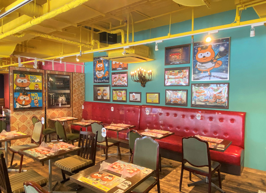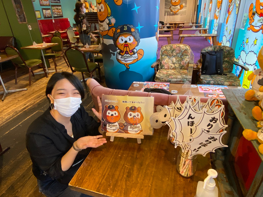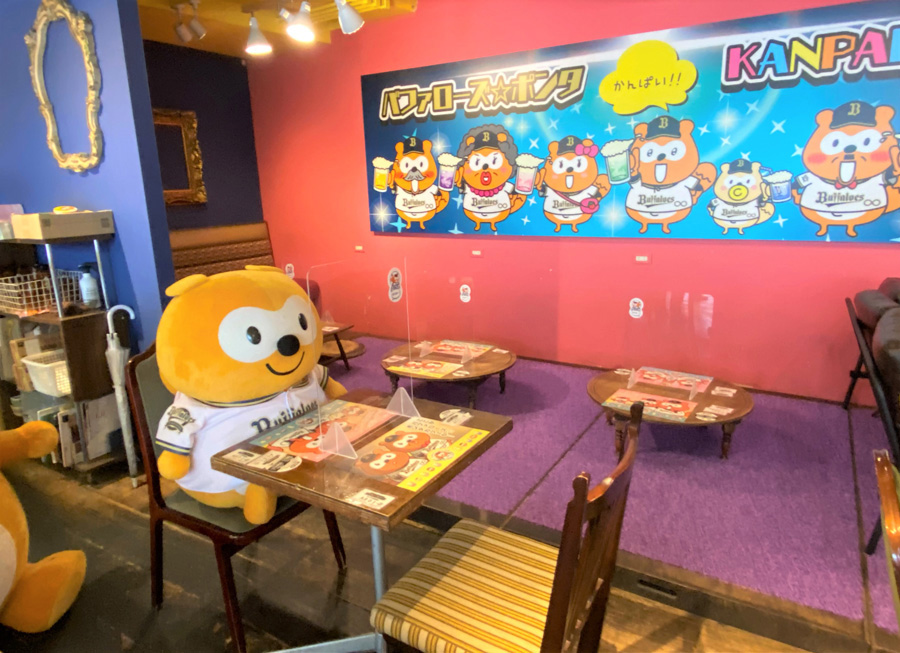 平日にはまだ空席があります。バファローズ愛がたっぷり詰まったバファローズ☆ポンタカフェ。ぜひお越しいただき、バファ☆ポンと一緒に「おりほー!」気分で乾杯しましょう。(西田光)
