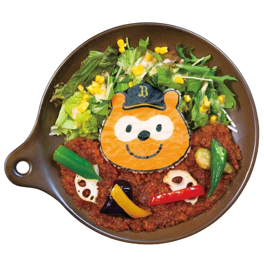 まずは「一緒に食べてWおう!バファ☆ポンカレーライス」。吉田さんが「これぞバファ☆ポンカフェと言えるメインメニュー」と話す気合の入った一皿。今シーズンのキャッチフレーズ「全員でW(笑)おう!!」とリンクさせ、お皿のど真ん中でバファ☆ポンがにっこり微笑んでいます。野菜もふんだんに使って彩りを加え、写真映えするように工夫したそうです。吉田さんは「バファローズ応援前後の栄養補給にもってこいです。がっつり食べたい男性ファンにもおすすめです」とボリュームにも自信を覗かせます。