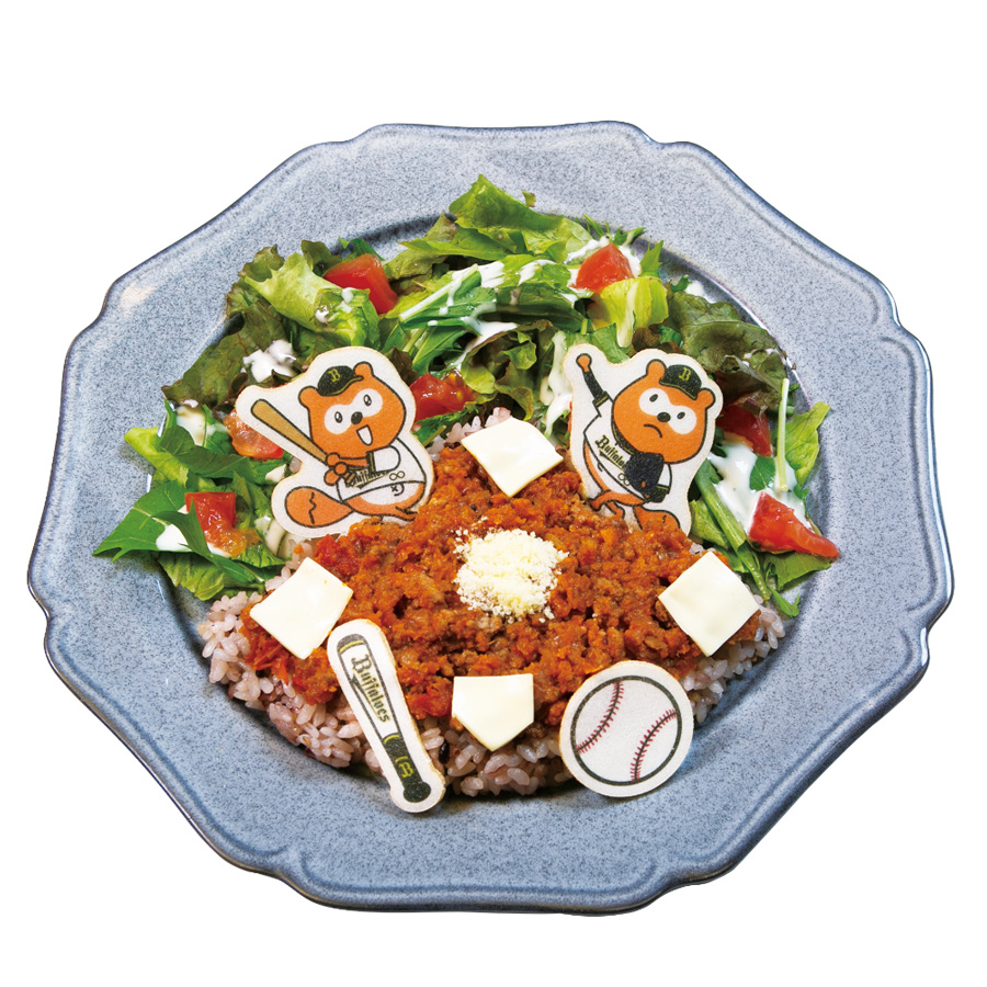 「バファ☆ポンタコライス球場~カフェの陣~」は、グラウンドをイメージしたユニークなメニューです。ミートで内野の土を、サラダで外野の芝生を表現。ベースはチーズを切り取り、マウンドは粉チーズを盛るなど、細部までこだわられています。吉田さんが「バファ☆ポンがお皿の上で野球をしているような楽しいタコライスに仕上がりました」と語る力作です。