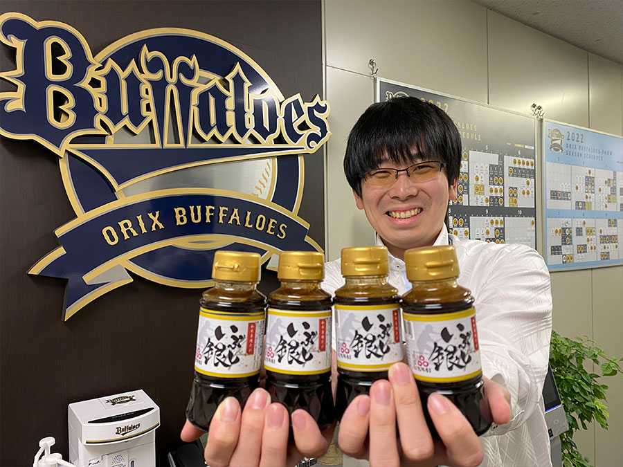 昨年のバファローズオフィシャルファンクラブ「BsCLUB」会員限定アイテムで「リュックか宮崎牛のどちらか1点」という不思議な選択肢を生み出してファンを悩ませた、球団事業推進部ファンクラブグループ。その中心メンバーの阿部優輝が、今年は宮崎牛のお届けにとどまらず、宮崎牛専用のオリジナルタレ開発にまで手を伸ばした。6月ごろから時間をかけて完成させたタレへの自信は格別で「宮崎牛のうまみを最大限まで際立たせられます。ごはんがむちゃくちゃ進みますよ」と誇らしげに話す。ラベルには大阪府の地産食材である認定「大阪産(おおさかもん)」のブランドロゴも。阿部仕込みの“究極の一品”に迫った。