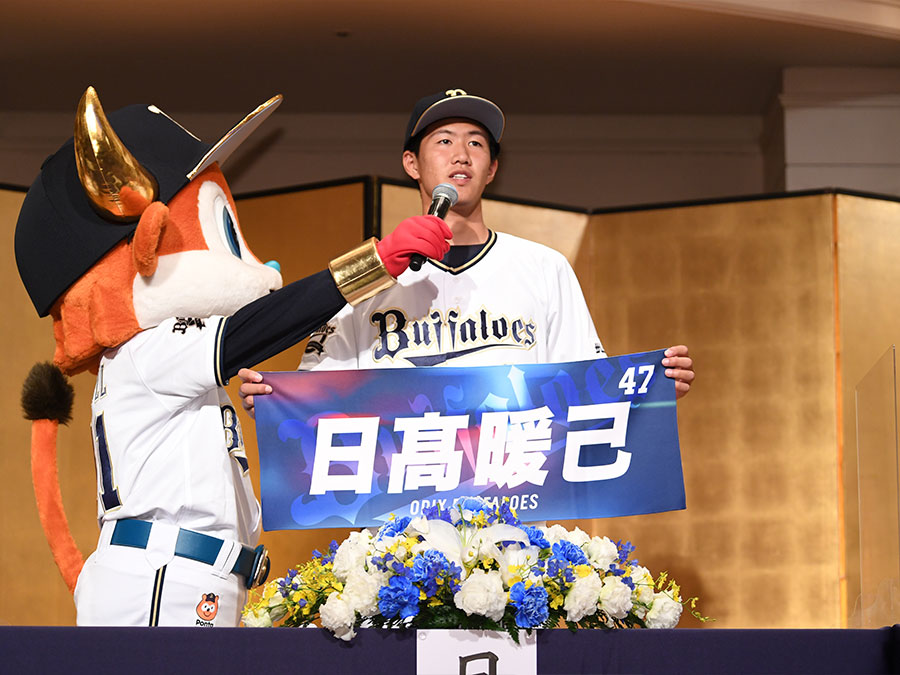 ドラフト5巡目指名。最速148キロの角度あるストレートが武器の本格派。高校時代、山本由伸投手をお手本に成長した18歳は、9回まで投げ抜く体力にも自信あり。目指すは山本由伸投手のような球界を代表する投手。富島高校からの入団。背番号47、日髙暖己!