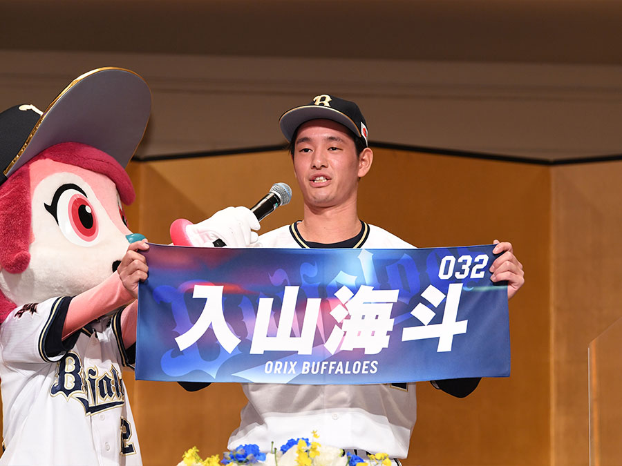 育成ドラフト3巡目指名。スリークォーター気味のフォームから繰り出す140キロ後半のストレートが持ち味。目標は、日本シリーズで大活躍を見せた育成出身の宇田川投手。将来は「緊迫した場面で任される投手になりたい」と意気込みを見せます。自身は大阪府守口市生まれで幼少期からのバファローズファン。東北福祉大学からの入団。背番号032、入山海斗!