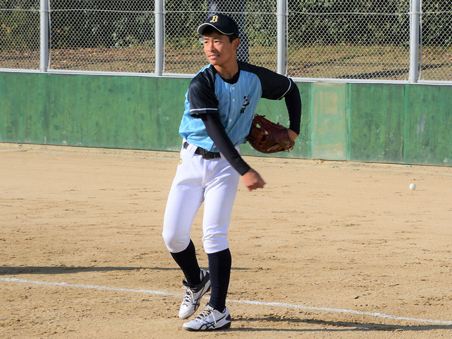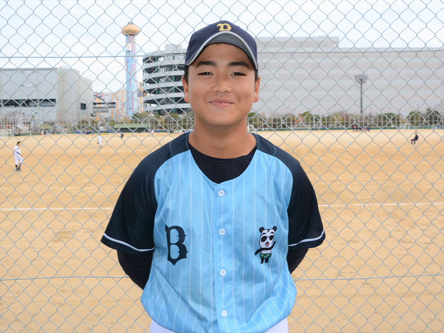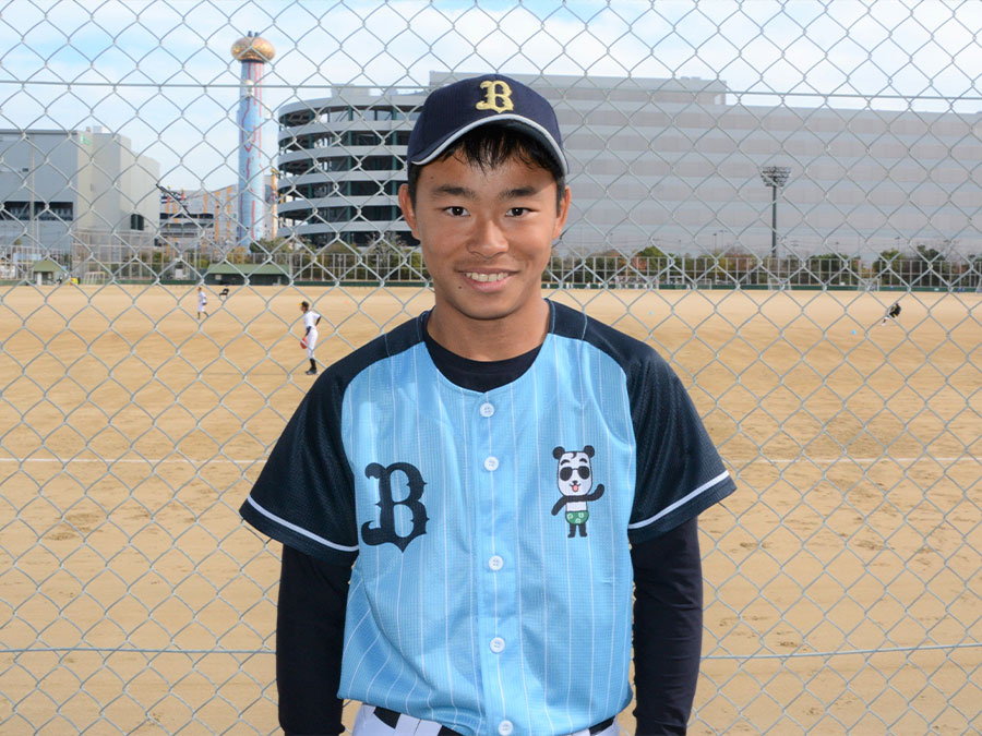 小川監督が「T-岡田選手、村上宗隆選手にあやかりました」と期待を込めて決めた55番を背負うのは北野蒼葉選手です。ポジションは、投手、内野手、外野手と、ユーティリティプレーヤー。所属する泉佐野レッドスターズでは、泉佐野市主催の少年野球大会で主力として活躍し優勝を経験。大きな自信をつけました。165センチ70キロの恵まれた体格を生かして迫力ある投球と打撃を披露する姿に、小川監督は「力でねじ伏せる投球、ホームランを狙える力強い打撃。両方素晴らしいものを持っています」と目を細めます。本人も「大谷翔平選手みたいに二刀流の活躍がしたい」と意欲満々です。