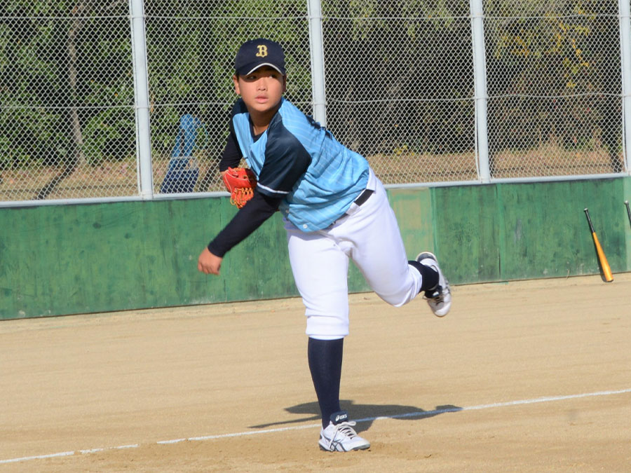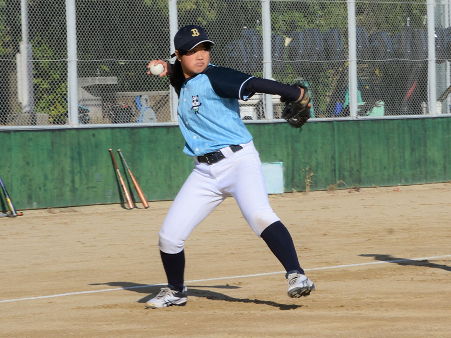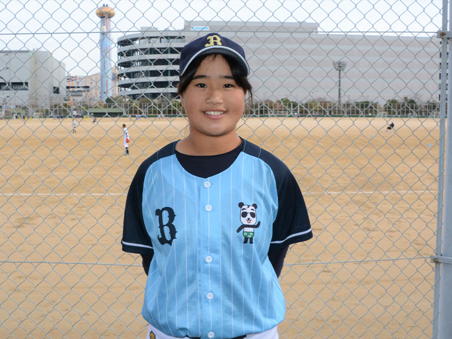 思い切りの良い打撃と俊足が持ち味の、田原ひより選手。野球を本格的に始めたのは小学4年生からですが、実力は十分。捕手としての能力も高く、小川監督は「ブロッキングが上手。捕手にふさわしい辛抱強さ、我慢強さも持ち合わせています」と高く評価します。平日は学校が終わるとバッティングセンターへ。「毎日お父さんと練習しています。引っ張るのが好きで、鋭い打球が飛ぶと嬉しい」と楽しみながら努力を重ねます。憧れは杉本裕太郎選手。「ラオウみたいな豪快なホームランを打てるようになりたい。昇天ポーズも格好いいです」と爽やかな笑顔で話します。