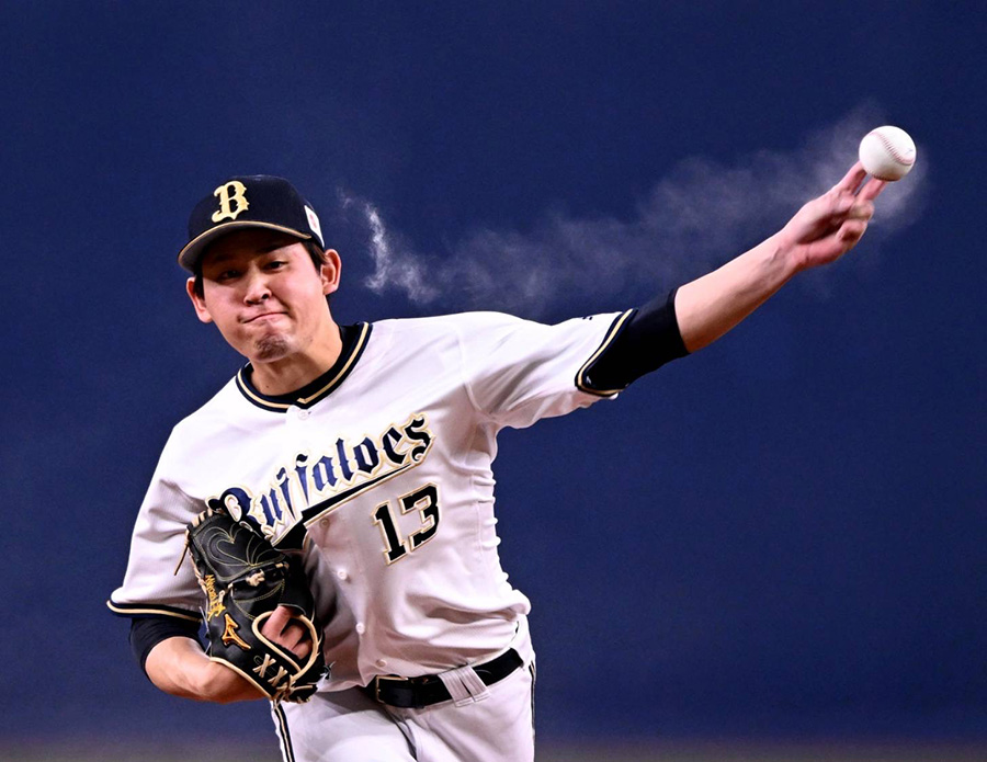 まずは、宮城大弥投手のこの一枚。4月20日の福岡ソフトバンクホークス戦、宮城投手が登板4試合目にして今シーズン初白星をつかんだ日の写真です。臨場感あふれる投球を捉えた一枚ですが、注目すべきは尾を引くようになびく真っ白なロジン。「ロジンと言えば山﨑福也投手のイメージがありますが、宮城投手も入念にロジンバッグを握る選手の一人です。それがわかる写真を撮っておきたかった」と松村カメラマン。さらに「粉が舞い上がる様子は幻想的なんですよね」と、ロジンが不思議なオーラのように宮城投手を引き立てていることに触れます。