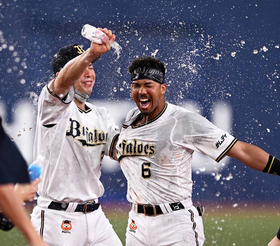 次は、9月19日、首位福岡ソフトバンクホークスとの天王山最後の試合で、宗佑磨選手がサヨナラ打を決めた直後の歓喜の瞬間です。若月健矢選手らから祝福のウォーターシャワーを大量に浴びせられ、喜びを大爆発させています。