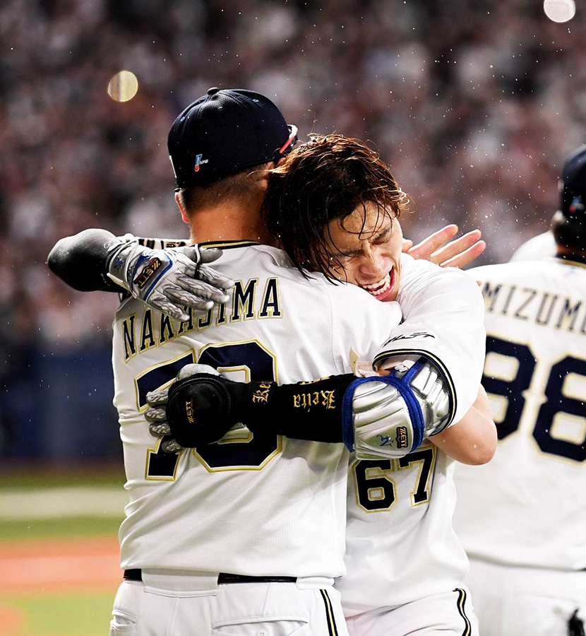 昨シーズンのポストシーズンはテレビで見守っていた中川圭選手。足が震えるほど緊張したという同点9回2死二、三塁のこれ以上ない場面で、見事三遊間を破る殊勲打を放ちました。「無敵の中川」と評して二軍監督時代から期待し続けてくれた中嶋監督への、恩返しともなる一打。大歓声に包まれながら指揮官の胸でこみ上げる喜びを訴える様子は、見る人の心も熱くさせました。