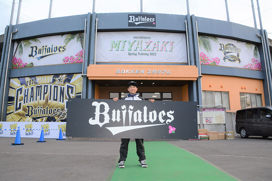 シーズン開幕に向けて調整する選手たちのピッチング、バッティングを間近で見ることができるバファローズ宮崎春季キャンプ。キャンプ地は、バファローズのみならず、宮崎の魅力までもが詰まった特別なスポットです。そのキャンプを陰で支え、プロデュースしてくれているのは宮崎市観光協会の矢野翔太さん。バファローズ担当8年目の矢野さんは「バファローズは僕にとっての“日常”です。毎試合必ず観ていますし、スマホの待ち受け画面ももちろんバファローズです」と愛情を持って語ります。そんな矢野さんに宮崎キャンプの魅力と楽しみ方を教えてもらいました。