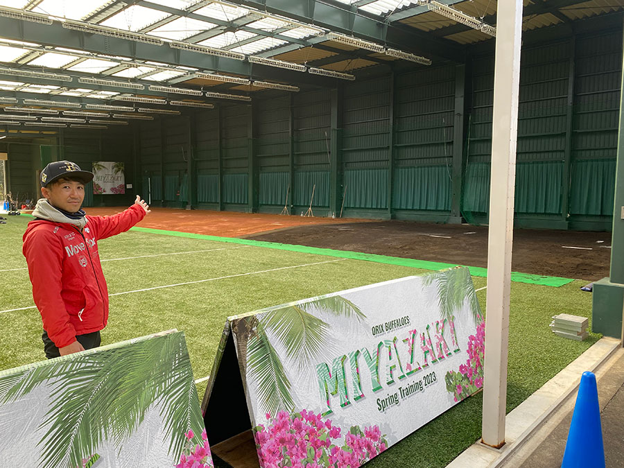 キャンプ地内の数ある施設の中で矢野さんがイチオシするスポットはブルペンです。「10レーンもある大規模な施設は、僕が知る限りここだけです。育成選手から球界を代表するエースまでがここにずらっと並んで技術を磨きます」と矢野さん。バファローズの意向も取り入れて作られた施設で、7レーンある明るい茶色のマウンドは京セラドーム大阪仕様です。