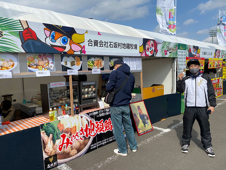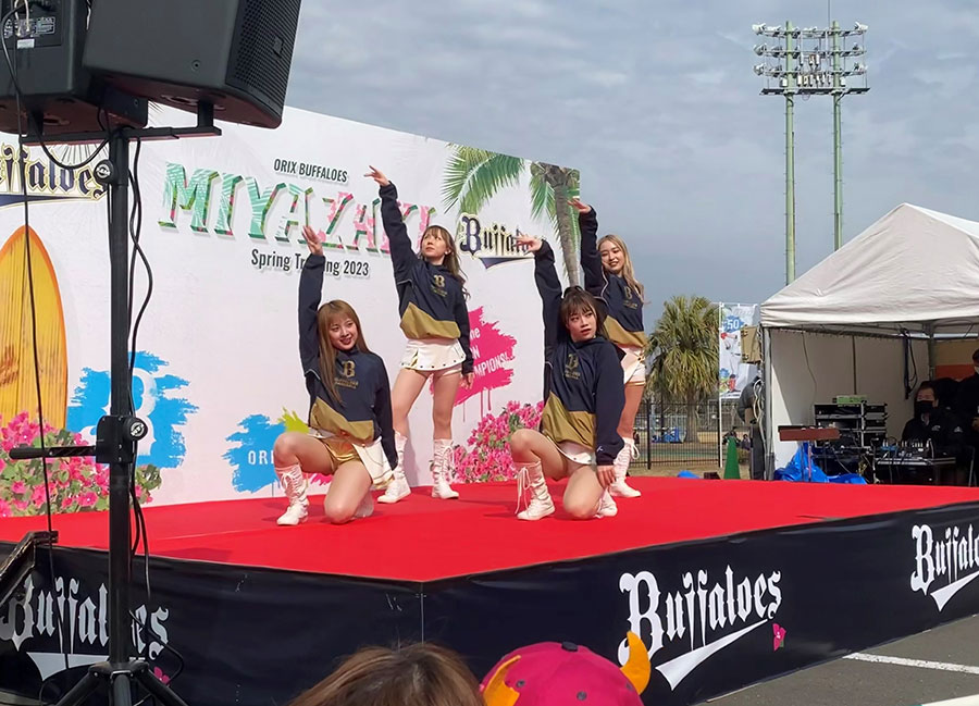 週末にはBsGirlsがパフォーマンスを披露するなど、楽しいイベントも盛りだくさん。「格好いい選手を見られるのはもちろん、おいしいグルメを食べられて、お土産も買える。バファローズのキャンプ地はちょっとした宮崎旅行が完結するスポットです。ぜひお越しください!」。バファローズと宮崎、両方の魅力を知り尽くした矢野さん。イベントの準備やお客様への対応などであちらこちらで声を掛けられ、キャンプ地内を走り回っています。「今日もおいしいお酒が飲めそうです!」。にっこり微笑んでSOKKENスタジアムの控室に戻っていきました。(西田光)