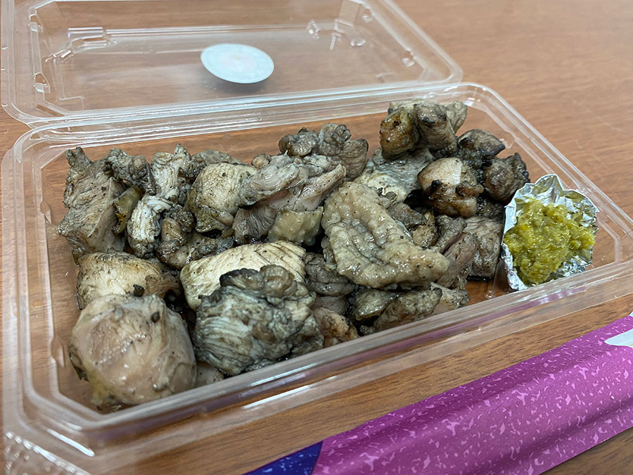 「合資会社石坂村地鶏牧場」では、良質な飼料を与えて自前の牧場で育てた「みやざき地頭鶏(じとっこ)」が使われています。店頭で炭火焼きされた出来たての地鶏はおいしさ抜群。歯ごたえがあり、ジューシーな味わいに「焼酎が欲しくなりますね」。焼酎についても語りだすと止まらなさそうな矢野さんでした。