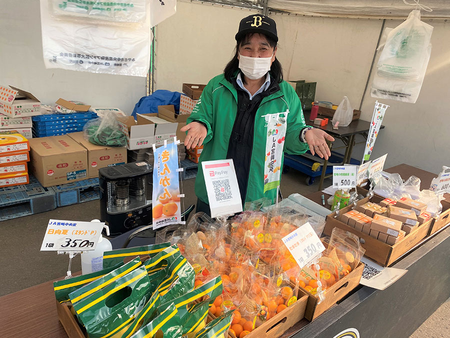 各種フルーツを取りそろえる「みやざき中央農産物ファン拡大事業委員会」も要チェック。中でもおみやげにおすすめなのは宮崎名物のきんかんたまたま。解禁日を設定し「きんかんヌーボー」として発信するほど、宮崎をあげてPRしているきんかんです。「皮ごと食べられるきんかんは珍しいですし、すごーく甘いです。きんかんたまたまにはリピーターが多いのも特徴です!」と矢野さんは語ります。