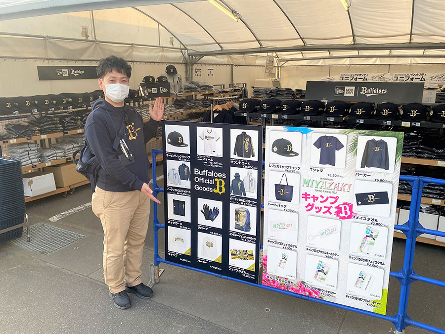 もちろんグッズも見逃せません。グッズストアでは、キャンプグッズをはじめ約600アイテムをそろえています。売れ行きはすでに絶好調。キャンプ初日としての売り上げは過去最高を更新したそうです。神戸・三宮の球団直営店「B-WAVE」の山口洋司店長は、グッズストアの責任者として初日から宮崎入り。「今年のキャンプは特に女性のお客様が多く、Sサイズのグッズがよく売れています。また、NEW ERAとコラボしたキャップも人気です。歓迎パレードで被った選手たちを見て『かっこいい』と思ってくれた人が多いようです」と盛況ぶりに笑顔をこぼします。