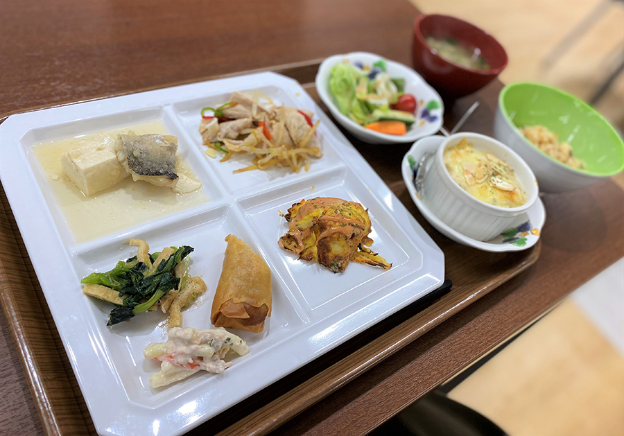 食事はずらりと並ぶ色とりどりのメニューから各自でお皿に乗せていくビュッフェ形式。夕食の主菜は、肉料理、魚料理、高たんぱく低脂質料理の3種類が用意されています。日替わりで提供されるメニューは副菜を含めてなんと8種類。さらに、サラダはもちろん、納豆、キムチ、ヨーグルトといった発酵食品や、ゆで卵、蒸し鶏、ツナなどの高たんぱく食品が毎日用意されています。