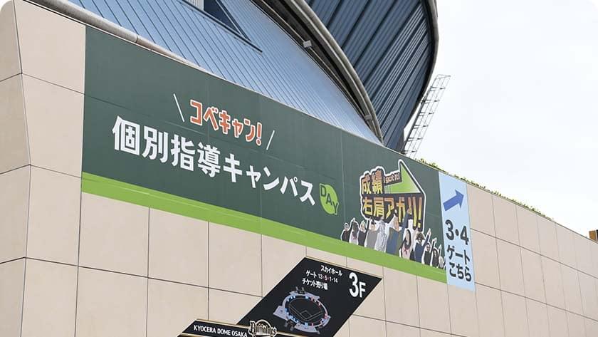 正面入口の東口階段部にゲームスポンサータイトルのバナーを掲出