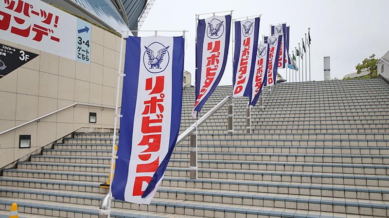 球場までの主導動線上にのぼりを30本設置し、来場者に社名・商品名をPR